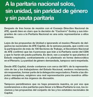 Lejos de las propuestas de Unidad e ignorando el masivo Plenario de delgados/as nacionales de ATE Capital, de la semana pasada, que contó con la participación de más de 100 Sectores de Trabajo, el Secretario Nacional de ATE confirmó que las 4 personas que irán a la Paritaria serán del CDN y que lo harán sin pauta paritaria. Es decir, van a aceptar lo que plantea el Estado empleador, contrariamente a lo planteado en forma democrática en el Plenario. La paridad de género demandada, tampoco será respetada.