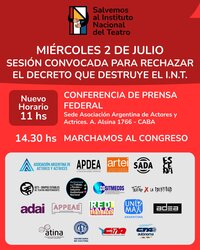 Con la consigna "Salvemos al Instituto Nacional del Teatro", las organizaciones artísticas y culturales marcharán a las 14.30 hacia el Congreso de la Nación. Convocan la Asociación Argentina de Actores y Actrices (AAAyA), la Asociación de Profesionales de la Dirección Escénica Argentina (APDEA), la Asociación Argentina de Teatro Independiente (ARTEI), el Sindicato Argentino de Autoras y Autores (SADA), la organización de teatro ESCENA, el Grupo Estable de Teatro Independiente (GETI), la Multisectorial por el Trabajo, la Ficción y la Industria Audiovisual Nacional, la Confederación Sindical de Trabajadores de los Medios de Comunicación Social (COSITMECOS), Teatro por la Identidad, la Asociación Docentes Artistas Investigadores de la UNA (ADAI), la Asociación Profesional de Productores Ejecutivos de las Artes Escénicas (APPEAE), la Red de Salas Teatrales de la Provincia de Buenos Aires, la Unión Internacional de la Marioneta (UNIMA), la Asociación de Diseñadores Escénicos de Argentina (ADEA), la Asociación de Teatristas Independientes para Niños y Adolescentes (ATINA), la Secretaría de Cultura de la CGT, la CTA-T y CTA-A.