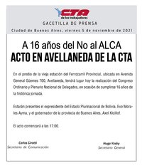 En el predio de la vieja estación del Ferrocarril Provincial, ubicada en Avenida General Güemes 700, Avellaneda, tendrá lugar hoy la realización del Congreso Ordinario y Plenario Nacional de Delegadxs, en ocasión de cumplirse 16 años de la histórica jornada.