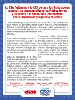 Las CTA expresan su máximo estado de alerta y su solidaridad con la tripulación de la Flotilla que intenta ayudar humanitariamente al pueblo palestino que está sufriendo un verdadero genocidio de la mano del gobierno de Netanyahu.