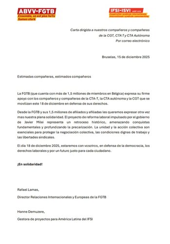 La FGTB (que cuenta con más de 1,5 millones de miembros en Bélgica) expresa su firme apoyo con los compañeros y compañeras de la CTA-T, la CTA autónoma y la CGT que se movilizan este 18 de diciembre en defensa de sus derechos.