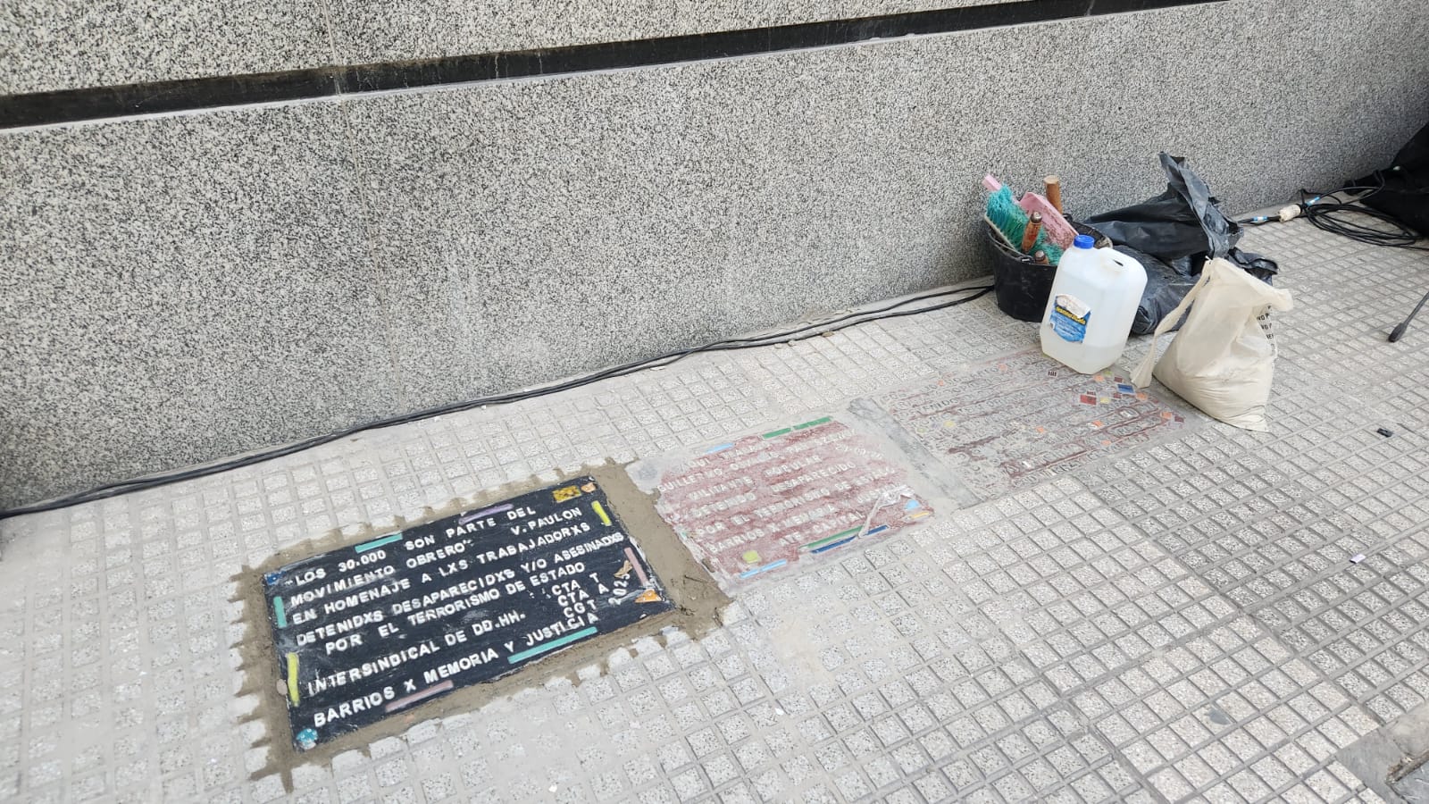 El viernes, Espacios Públicos del Gobierno de la Ciudad había hecho el agujero para colocar la baldosa. Pero la Secretaría de Trabajo de la Nación volvió a tapar el hueco ayer lunes. Pese a ello, la baldosa fue colocada durante el encuentro.