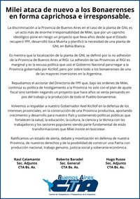 Repudiamos el accionar del Directorio de YPF que, bajo las órdenes de Milei, continúa su política de hostigamiento a la Provincia no solo con el plan de ajuste fiscal sino también negando un proyecto que hace años se venía pensando en pos del trabajo y la producción de todo el Pueblo bonaerense.