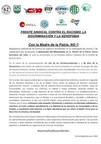 Repudiamos totalmente los hechos de violencia acontecidos en la madrugada del viernes 1º de septiembre que provocaron la destrucción del Monumento de la “Madre de la Patria” María Remedios del Valle, el cual se encontraba en la Plazoleta Alfonso Castelao de la Ciudad de Buenos Aires.