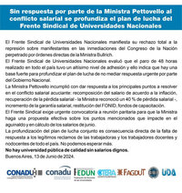 La Ministra Pettovello incumplió con dar respuesta a los principales puntos a resolver en el conflicto salarial acuciante: recomposición del salario de acuerdo a la inflación, recuperación de la pérdida salarial - la Ministra reconoció un 40% de pérdida salarial -, incremento de la garantía salarial, restitución del FONID, fondos de capacitación.