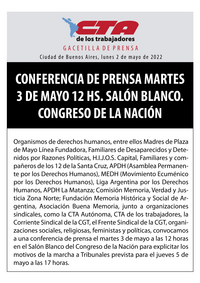 Organismos de derechos humanos, entre ellos Madres de Plaza de Mayo Línea Fundadora, Familiares de Desaparecidos y Detenidos por Razones Políticas, H.I.J.O.S. Capital, Familiares y compañeros de los 12 de la Santa Cruz, APDH (Asamblea Permanente por los Derechos Humanos), MEDH (Movimiento Ecuménico por los Derechos Humanos), Liga Argentina por los Derechos Humanos, APDH La Matanza; Comisión Memoria, Verdad y Justicia Zona Norte; Fundación Memoria Histórica y Social de Argentina, Asociación Buena Memoria, junto a organizaciones sindicales, como la CTA Autónoma, CTA de los trabajadores, la Corriente Sindical de la CGT, el Frente Sindical de la CGT, organizaciones sociales, religiosas, feministas y políticas, convocamos a una conferencia de prensa el martes 3 de mayo a las 12 horas en el Salón Blanco del Congreso de la Nación para explicitar los motivos de la marcha a Tribunales prevista para el jueves 5 de mayo a las 17 horas.