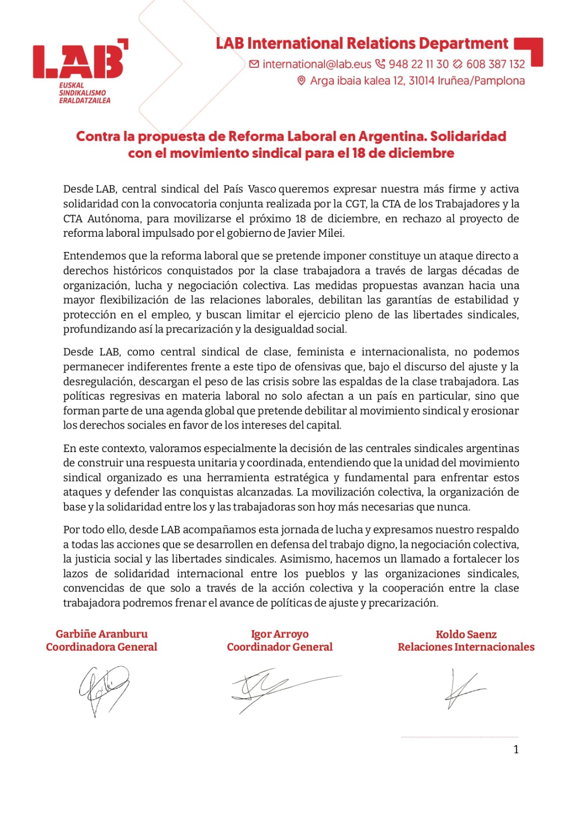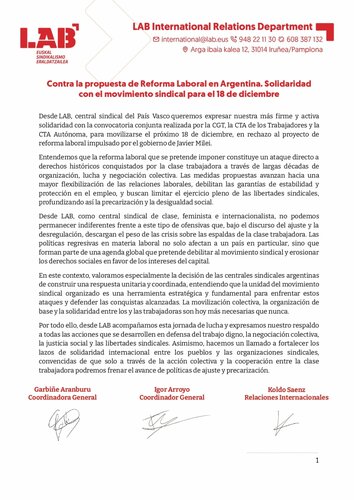 Desde LAB, central sindical del País Vasco queremos expresar nuestra más firme y activa solidaridad con la convocatoria conjunta realizada por la CGT, la CTA de los Trabajadores y la CTA Autónoma, para movilizarse el próximo 18 de diciembre, en rechazo al proyecto de reforma laboral impulsado por el gobierno de Javier Milei.