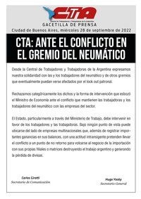 Desde la Central de Trabajadores y Trabajadoras de la Argentina expresamos nuestra solidaridad con las y los trabajadores del neumático y de otros gremios que eventualmente puedan verse afectados por el lock out patronal.