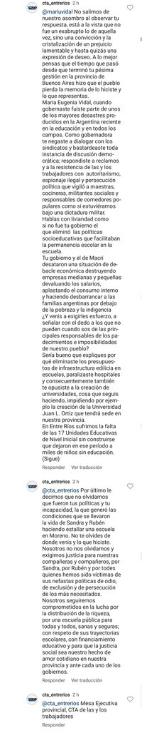 La central entrerriana recordó, en una publicación en su cuenta de Instagram, la postura de Vidal respecto a la educación superior, cuando fue gobernadora de Buenos Aires. Lo que fue comentado por ella y replicado a su vez por la Mesa Ejecutiva provincial de la Central de Trabajadores y Trabajadoras de la Argentina.