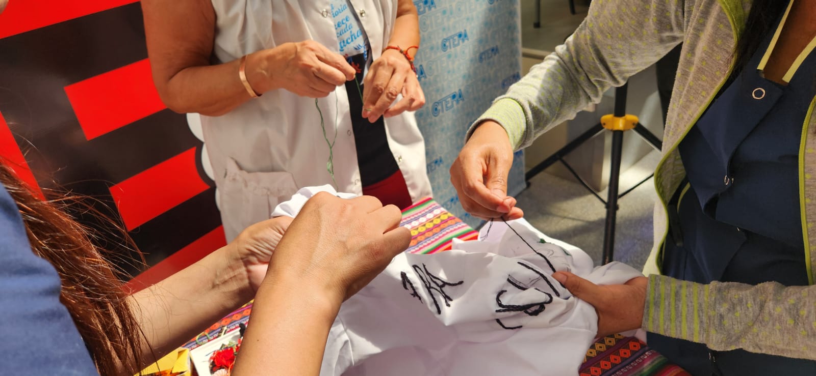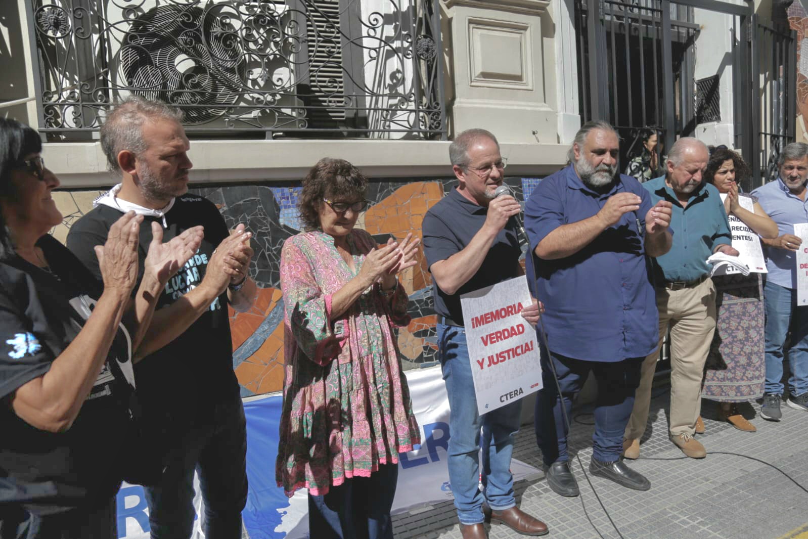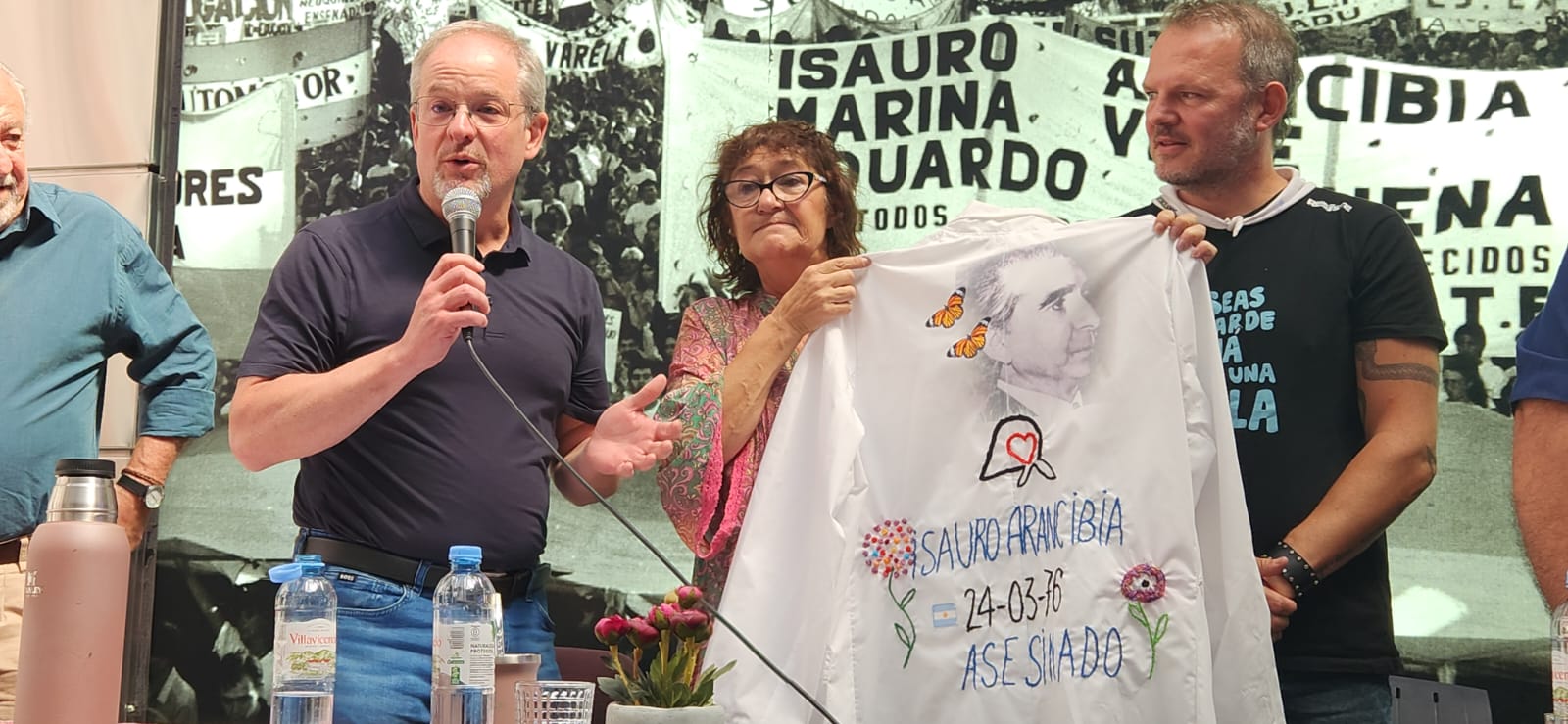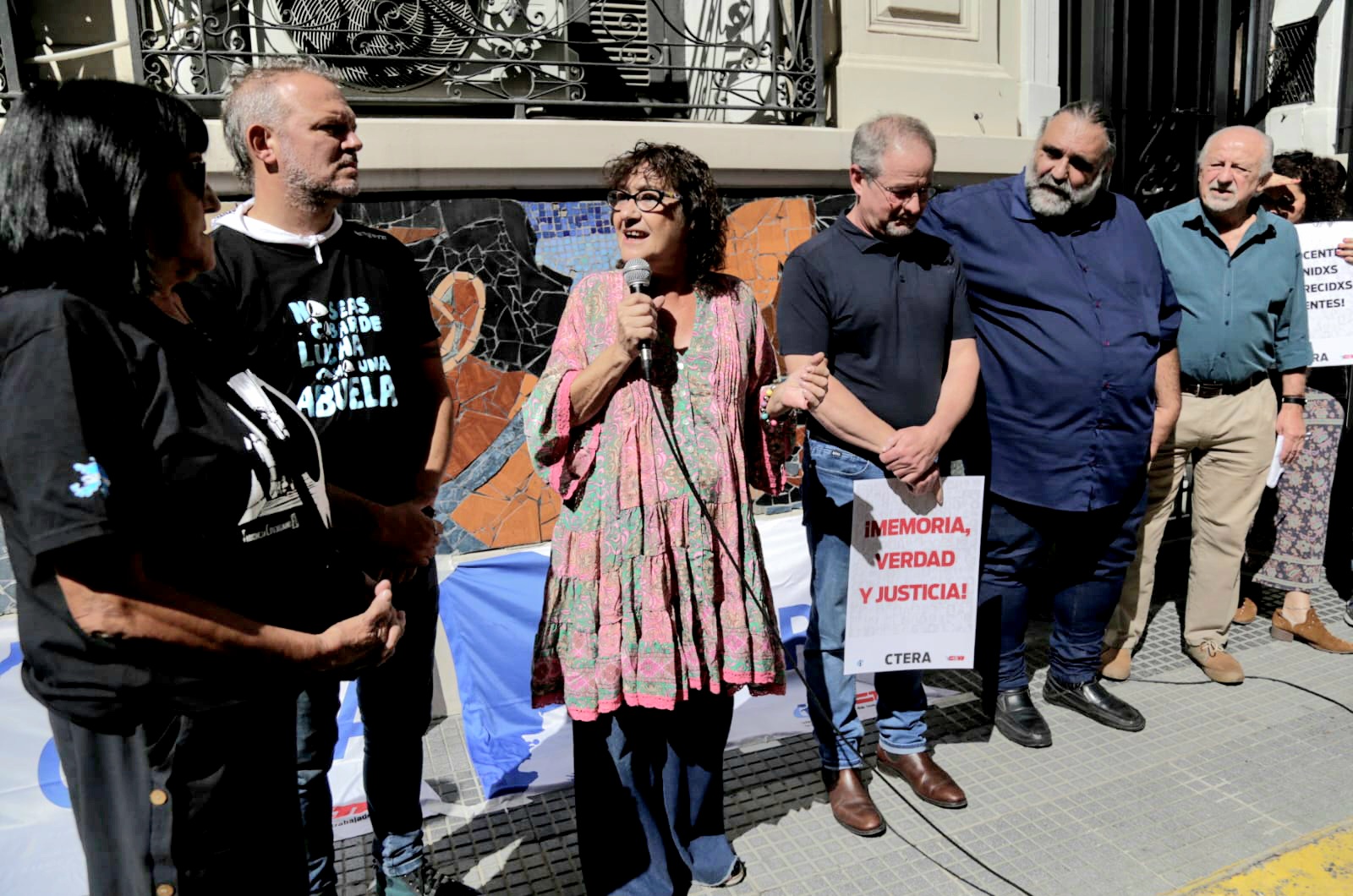 “Ayer, esa marea humana hizo naufragar al negacionismo”, aseguró Hugo Yasky, y agregó: “La derecha nunca llega de un día para el otro. Se va incubando el huevo de la serpiente. Del mismo modo, los triunfos populares nunca aparecen de un día para el otro. Se van construyendo. Se van produciendo hechos que, en cuanto tienen el protagonismo del pueblo, se van generando líneas de las que no se retrocede. Y eso fue lo que sucedió ayer. Comenzar a construir los mojones de la derrota de Milei en 2027”, subrayó. Y llevó un presente para Sonia y para Robi: Un pañuelo bordado por docentes del SUTEBA, de la seccional San Miguel, que tiene el nombre de Susana Pertierra, directora de escuela en General Sarmiento (hoy Malvinas Argentinas), compañera de Stella Maldonado, y trabajadora secuestrada por la última dictadura cívico militar mientras trabajaba.