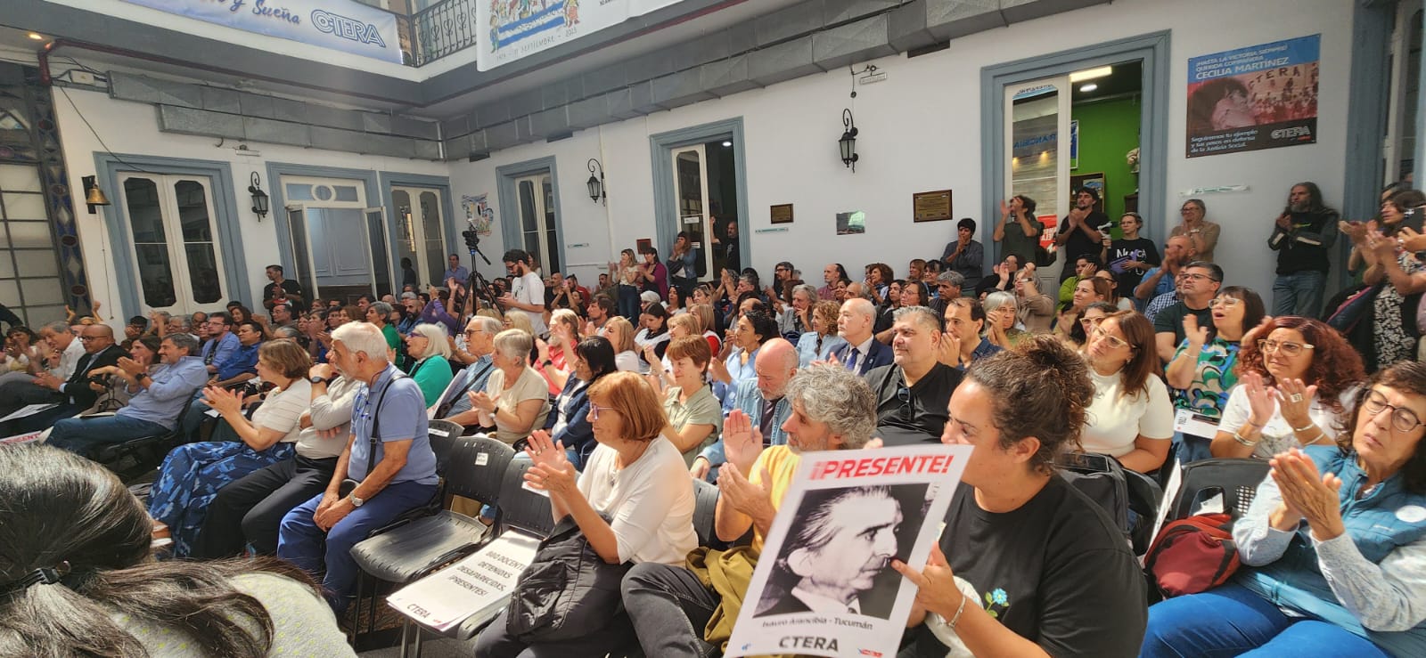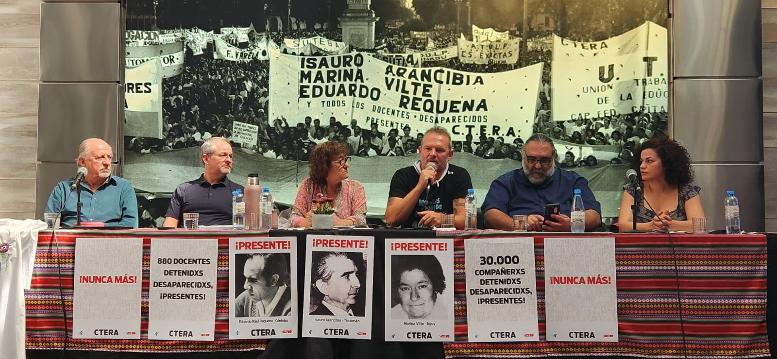 Entre otrxs compañerxs, se contó con la presencia de David Edwards, secretario general de la IE; Sonia Alesso, secretaria general de la CTERA; Hugo Yasky, secretario general de la CTA-T y diputado nacional; Roberto Baradel, secretario adjunto de la CTERA y secretario de Relaciones Internacionales de la CTA-T; Charly Pisoni, integrante de H.I.J.O.S. Capital, y Gabriela Bonilla, directora regional de la Internacional de la Educación para América Latina (IEAL), de Costa Rica, quienes compartieron unas palabras con lxs presentes.