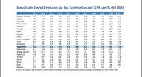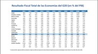 G20, ustedes saben, el G20 del cual Argentina forma parte, se integra por países desarrollados y emergentes. Nosotros somos parte de los emergentes. Miren: ahí está el resultado fiscal primario de las economías del G20. Miren en la posición de déficit que está la Argentina, decimotercera, 13, el número de la yeta. Ahí estamos. Fíjense todos los países anteriores. Todos los países anteriores tienen muchísimo más déficit que nosotros. Ese es el primario. Fíjense Estados Unidos, ese se lleva las palmas. Estados Unidos se lleva las palmas. El mayor déficit fiscal lo tiene Estados Unidos. Y no de ahora del XXI, vienen históricamente con déficit fiscal. Lo mismo países como Francia, como Japón, déficit fiscal. ¿Me ponen el mapita? Miren. Este es el mapita.