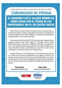 Desde la CTA de las y los Trabajadores y la CTA Autónoma denunciamos un complot de los sectores empresariales con el gobierno nacional, que denigra un espacio tripartito como lo es el Consejo del Salario, para seguir derrumbando los salarios de los trabajadores, para acrecentar las ganancias de sus empresas y para que el presidente Javier Milei siga gobernando por decreto.