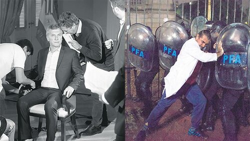 Seguro, no le gusta que lo vean así. Lo están adecuando para una exposición pública. Al hombre nada lo intimida más que lo público. De ahí la arrogancia que se impone, esa expresión que es puro recelo. Está rodeado de asesores que lo decoran, lo maquillan y lo instruyen para una entrevista de Bloomberg News, una compañía estadounidense especializada en software financiero, datos y noticias. Un asesor le susurra, quizá le está recordando la letra, lo que tiene que decir, el libreto que otros, más poderosos que él, quieren escuchar. Si esta imagen, que corresponde a septiembre de 2017, impresiona es porque el hombre es el presidente de la nación. Fue educado en los buenos modales de clase y en la utilización de la canchereada como artilugio de seducción para obtener lo que sea, una mujer hermosa, un equipo de fútbol, la suma del poder público. Pero el costo es alto. El carisma que persigue en público, su máscara de ganador, no puede ser revelada como una producción. Le inquieta, y se le nota, ser descubierto detrás de escena. La foto la tomó Pablo Piovano, un fotógrafo que trabajaba en este diario y que se ha jugado contra los intereses monopólicos denunciando los estragos causados por los agrotóxicos, hombres y niños convertidos en esperpentos agonizantes. Piovano, al revés del presidente, no teme poner el cuerpo a situaciones de riesgo, lo prueban los balazos de gendarmería que lo hirieron durante la protesta contra la reforma previsional ante el Congreso cuatro meses después de aquella foto donde capturó la expresión del presidente en la oscuridad. Esta imagen es una de las tantas que componen la muestra de Argra (Asociación de Reporteros Gráficos de Argentina), una muestra colectiva de la diversidad de formas que adquiere la violencia política.