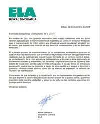 En representación de ELA España, su secretario general Mitxel Lakuntza envió un escrito a la CTA-T en solidaridad ante los "duros recortes aplicados por el nuevo Gobierno de Argentina así como por el nuevo ’Protocolo para el mantenimiento del orden público ante el corte de vías de circulación’, que supone una violación de los derechos fundamentales y de las libertades sindicales".