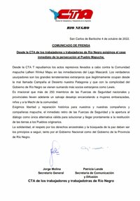 Desde la CTA Río Negro repudiamos los actos represivos llevados a cabo contra la comunidad mapuche Lafken Winkul Mapu en las inmediaciones del lago Mascardi.