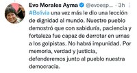 Por último, concluyó: "Bolivia una vez más le dio una lección de dignidad al mundo. Nuestro pueblo demostró que con sabiduría, paciencia y fortaleza fue capaz de derrotar en urnas a los golpistas. No habrá impunidad. Por memoria, verdad y justicia, defenderemos junto al pueblo nuestra democracia".