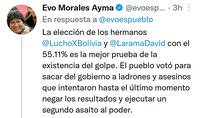 "La elección de los hermanos Lucho Arce y David Choquehuanca con el 55.11% es la mejor prueba de la existencia del golpe. El pueblo votó para sacar del gobierno a ladrones y asesinos que intentaron hasta el último momento negar los resultados y ejecutar un segundo asalto al poder", agregó.