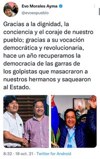 En un hilo de tuit, el compañero Evo tuitteó: "Gracias a la dignidad, la conciencia y el coraje de nuestro pueblo; gracias a su vocación democrática y revolucionaria, hace un año recuperamos la democracia de las garras de los golpistas que masacraron a nuestros hermanos y saquearon al Estado".
