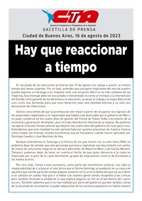 Por otro lado, frente a este escenario, como parte del movimiento sindical, nos cabe la responsabilidad de ir a buscar el voto de los que el último domingo se quedaron en su casa y de aquellos que siendo parte del campo popular pusieron en la urna la boleta del que los va a llevar a un callejón sin salida. Hay que ir a hablar con nuestra gente siendo receptivos a las críticas pero también diciendo la verdad de lo que implica pegarse un tiro en el pie dentro del cuarto oscuro. También sabemos que si no hay medidas por parte del gobierno que den señales claras de la voluntad de recomponer el poder adquisitivo de los sectores populares no habrá manera de revertir la decisión que tomaron los que no fueron a votar o los que optaron por darle su voto a la oposición.