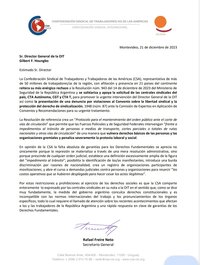 La Confederación Sindical de Trabajadores y Trabajadoras de las Américas (CSA), representativa de más de 50 millones de trabajadores/as de la región, con afiliación y presencia en 21 países del continente reitera su más enérgico rechazo a la Resolución núm. 943 del 14 de diciembre de 2023 del Ministerio de Seguridad de la República Argentina y se solidariza y apoya la solicitud de las centrales sindicales del país, CTA Autónoma, CGT y CTA T, para promover la urgente intervención del Director General de la OIT así como la presentación de una denuncia por violaciones al Convenio sobre la libertad sindical y la protección del derecho de sindicalización, 1948 (núm. 87) ante la Comisión de Expertos en Aplicación de Convenios y Recomendaciones para su urgente tratamiento.
