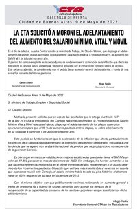 En el día de la fecha, nuestra Central solicitó al ministro de Trabajo, Dr. Claudio Moroni, que disponga el adelantamiento de las tres etapas acordadas oportunamente para hacer efectiva la totalidad del 45% de aumento del SMVM al 1° de julio del corriente año.