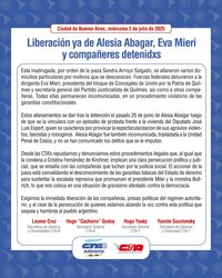 Desde las CTA’s repudiamos y denunciamos estos procedimientos ilegales que, al igual que la condena a Cristina Fernández de Kirchner, implican una clara persecución política y judicial, que se ensaña con las compañeras que luchan por la justicia social. El accionar de la jueza está convalidando el desconocimiento de las garantías básicas del Estado de derecho para sustentar la escalada represiva que promueven el presidente Milei y la ministra Bullrich, lo que nos coloca en una situación de gravisimo atentado contra la democracia.