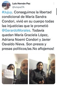 Y agregó: “Todavía quedan María Graciela López, Adriana Noemi Condori y Javier Osvaldo Nieva. Son presos y presas políticos/as. No aflojemos!”.