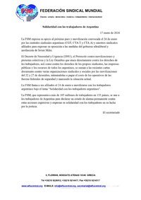 La FSM, que representa a más de 105 millones de trabajadores en 133 países, se une a los trabajadores de Argentina para declarar un estado de alarma permanente contra estas acciones regresivas y expresar su solidaridad con los trabajadores en su lucha por la justicia.