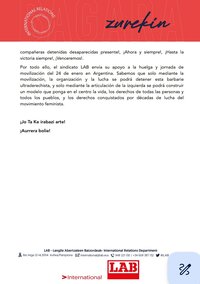 Por todo ello, el sindicato LAB envía su apoyo a la huelga y jornada de movilización del 24 de enero en Argentina. Sabemos que solo mediante la movilización, la organización y la lucha se podrá detener esta barbarie ultraderechista, y solo mediante la articulación de la izquierda se podrá construir un modelo que ponga en el centro la vida, los derechos de todas las personas y todos los pueblos, y los derechos conquistados por décadas de lucha del movimiento feminista.