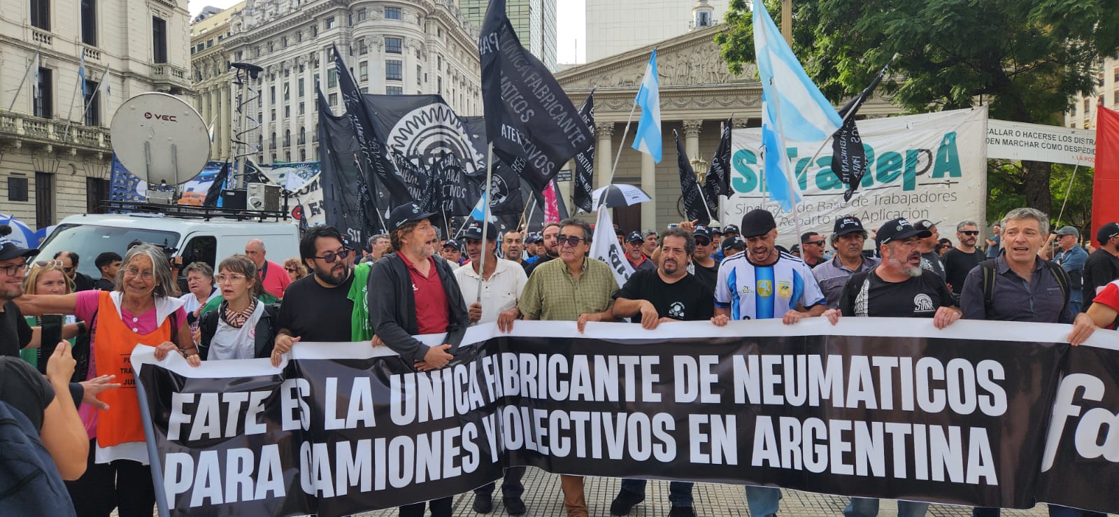 La CTA-T y CTA-A, junto a organizaciones sociales, sindicales y políticas, acompañaron este martes, el reclamo del SUTNA en Plaza de Mayo por la reapertura de la empresa fabricante de neumáticos Fate, la reincorporación de todxs lxs trabajadorxs despedidxs y el pago de los salarios adeudados.