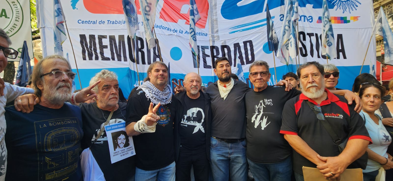 Daniel Catalano, secretario general adjunto de la CTA-T y titular de ATE Capital, consideró: “Son 50 años en un país que resiste, de democracia ininterrumpida, hoy con la particularidad de tener presos políticos, de tener a Cristina Fernández de Kirchner, además de proscripta, presa, y presa por resistir. Así que tenemos mucha tarea por hacer y mucho compromiso de la sociedad. También tenemos presxs a Milagro Sala, Julio de Vido y tantos otros luchadores que dieron su vida por un proyecto de país. Un pueblo organizado, movilizado, también diciéndole que no a las políticas de ajuste de Javier Milei”.