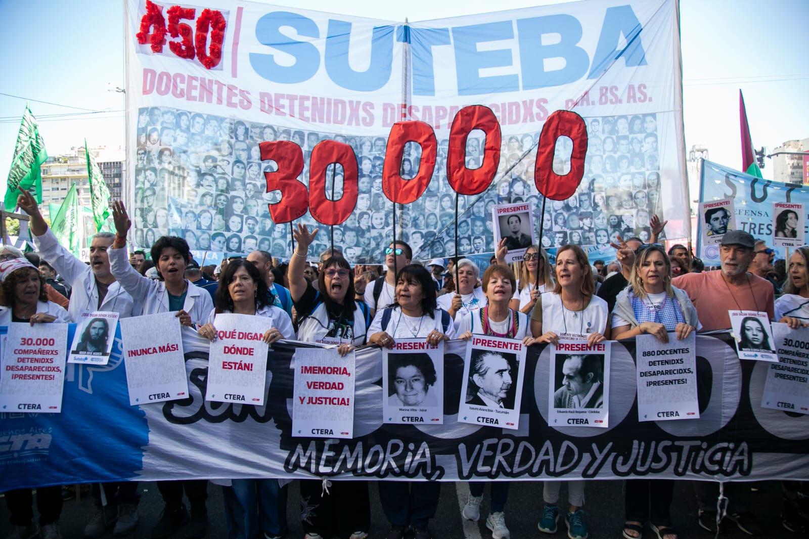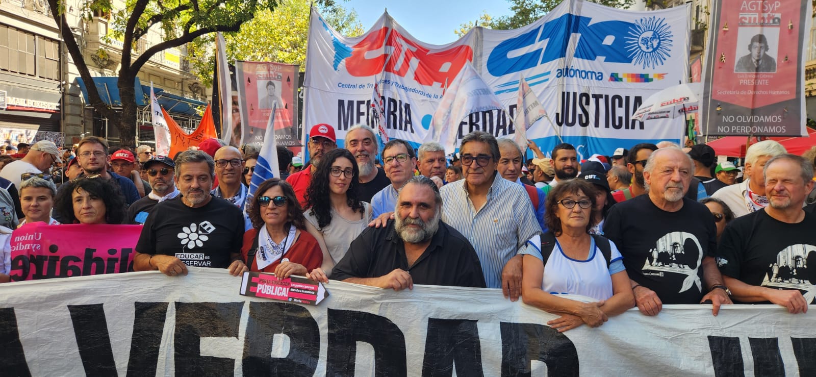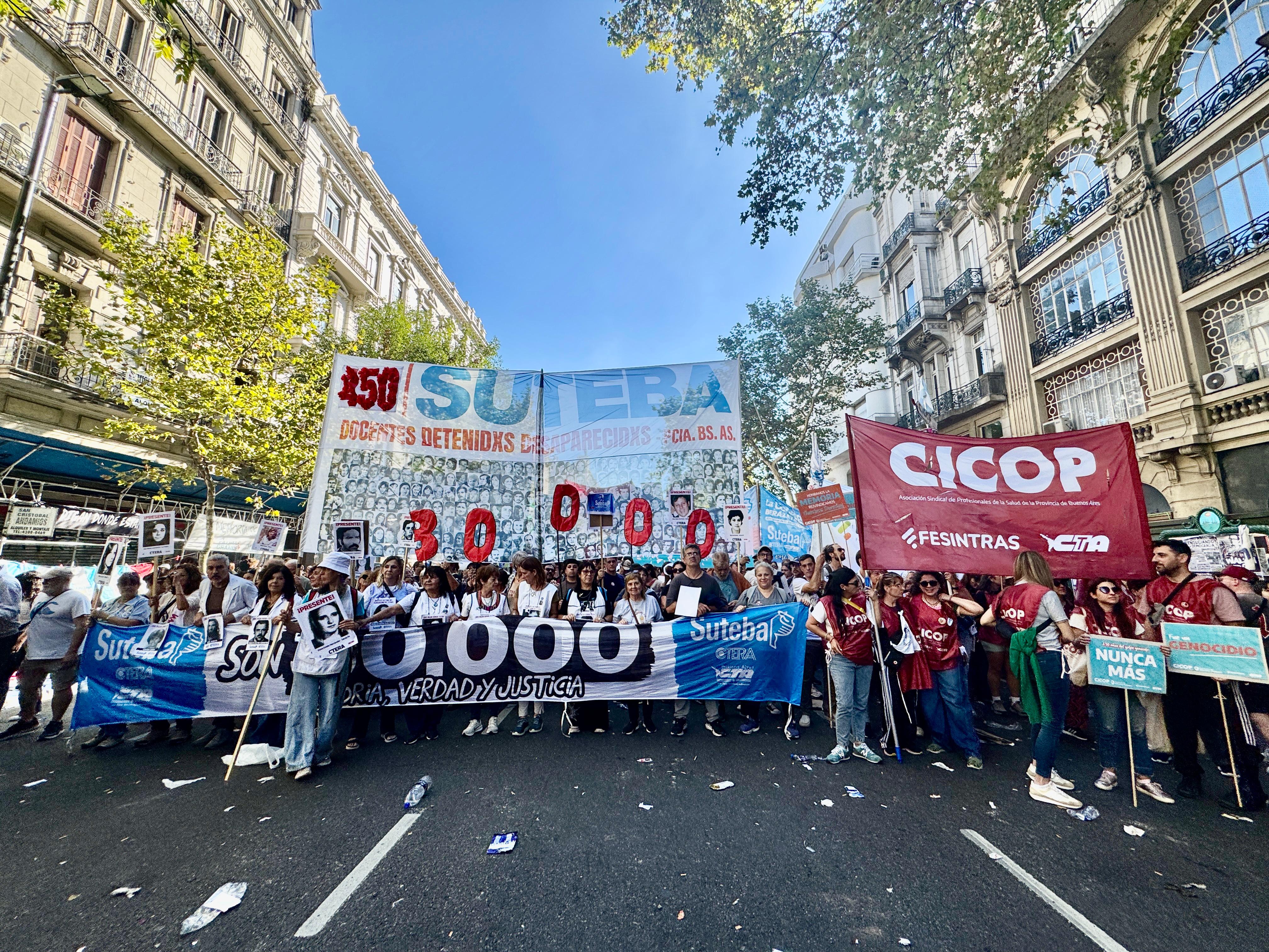 Roberto Baradel, secretario general del SUTEBA, CTA-T provincia de Buenos Aires y secretario de Relaciones Internacionales de la CTA-T Nacional, señaló: “Cientos de miles salimos a las calles hoy para decir Nunca Más. No queremos las políticas de odio, de crueldad de la dictadura militar, y tampoco las del gobierno de Milei”.