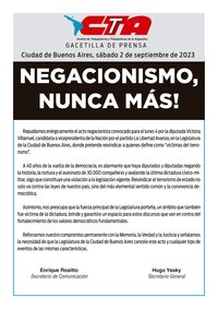 Repudiamos enérgicamente el acto negacionista convocado para el lunes 4 por la diputada Victoria Villarruel, candidata a vicepresidenta de la Nación por el partido La Libertad Avanza, en la Legislatura de la Ciudad de Buenos Aires, donde pretende reivindicar a quienes define como “víctimas del terrorismo”.