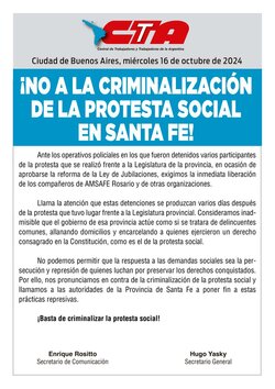 No podemos permitir que la respuesta a las demandas sociales sea la persecución y represión de quienes luchan por preservar los derechos conquistados. Por ello, nos pronunciamos en contra de la criminalización de la protesta social y llamamos a las autoridades de la Provincia de Santa Fe a poner fin a estas prácticas represivas.