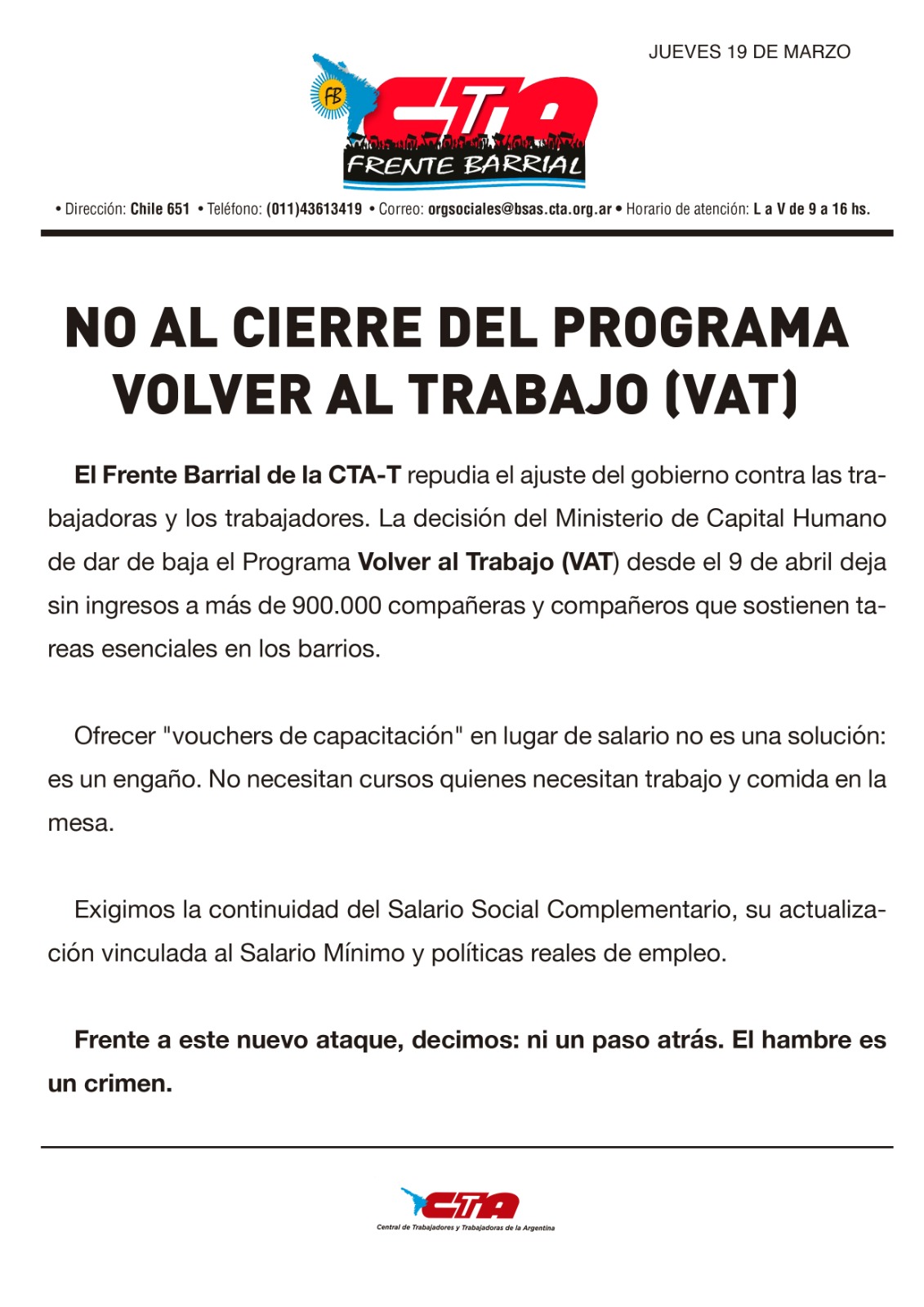 La decisión del Ministerio de Capital Humano de dar de baja el Programa Volver al Trabajo (VAT) desde el 9 de abril deja sin ingresos a más de 900.000 compañeras y compañeros que sostienen tareas esenciales en los barrios.