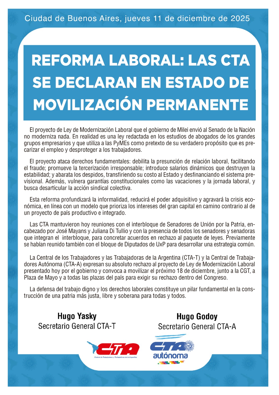 La Central de los Trabajadores y las Trabajadoras de la Argentina (CTA-T) y la Central de Trabajadores Autónoma (CTA-A) expresan su absoluto rechazo al proyecto de Ley de Modernización Laboral presentado hoy por el gobierno y convoca a movilizar el próximo 18 de diciembre, junto a la CGT, a Plaza de Mayo y a todas las plazas del país para exigir su rechazo dentro del Congreso.