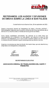 Desde la Asociación Gremial de Trabajadores del Subte y Premetro (AGTSyP - Metrodelegadxs) reiteramos que los audios y difusiones de Emova que afirman que la demora en la Línea B se debe a medidas de fuerza gremial son falsos.