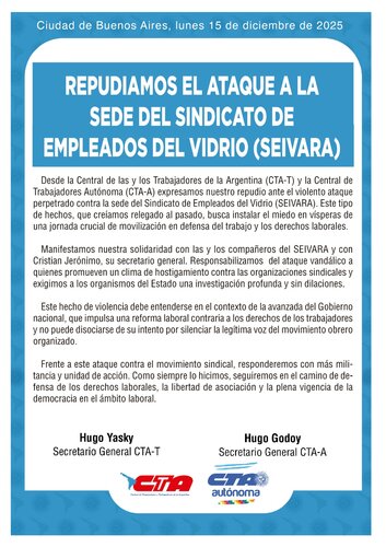 Desde la Central de las y los Trabajadores de la Argentina (CTA-T) y la Central de Trabajadores Autónoma (CTA-A) expresamos nuestro repudio ante el violento ataque perpetrado contra la sede del Sindicato de Empleados del Vidrio (SEIVARA). Este tipo de hechos, que creíamos relegado al pasado, busca instalar el miedo en vísperas de una jornada crucial de movilización en defensa del trabajo y los derechos laborales.