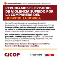 Desde el Consejo Directivo de la Asociación Sindical de Profesionales de la Salud de la Provincia de Buenos Aires (CICOP) hacemos público nuestro más enérgico repudio al episodio de violencia sufrido por la compañera Mariana Lucía Cañete, Jefa de Guardia del Hospital Sor María Ludovica de La Plata.