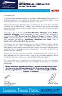 La Asociación del Personal Aeronáutico repudia la media sanción que obtuvo la Ley de Bases, lograda con una mayoría de diputados que se dispuso a legislar a favor de las corporaciones y en contra de las mayorías populares.