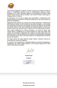 Repudiamos esta práctica que esconde las oscuras posiciones e intereses que definitivamente atentan contra los derechos del pueblo trabajador y una sociedad que comenzará a transitar por los tortuosos caminos de la violencia. No les bastó con atentar contra su vida, ahora pretenden su asesinato político y moral en una absurda condena por corrupción que no soporta el menor análisis legal y contable.