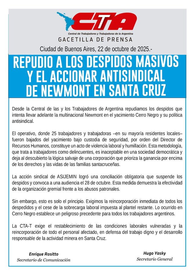 Desde la Central de las y los Trabajadores de Argentina repudiamos los despidos que intenta llevar adelante la multinacional Newmont en el yacimiento Cerro Negro y su política antisindical.
