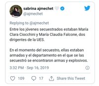 En esa misma línea, señaló: “Entre los jóvenes secuestrados estaban María Clara Ciocchini y María Claudia Falcone, dos dirigentes de la UES. En el momento del secuestro, ellas estaban armadas y en el departamento en el que se las secuestró se encontraron armas y explosivos”.