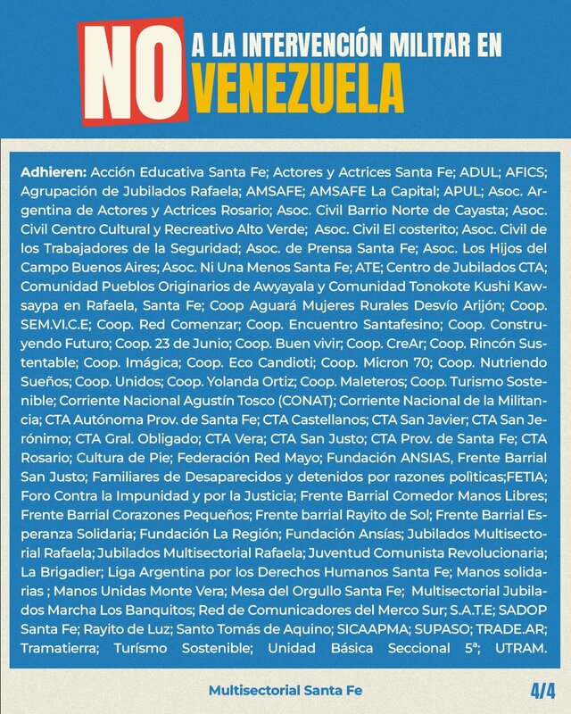 Organizaciones de la ciudad de Santa Fe, unidas en el reclamo por la paz de los territorios de América Latina, realizaron en la sede de la CTA una conferencia en repudio a la amenaza de intervención militar de Estados Unidos en Venezuela.