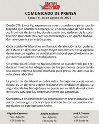 Desde la CTA Santa Fe, expresamos nuestro profundo pesar por la tragedia que ocurrió el domingo 17 en la localidad de San Lorenzo, provincia de Santa Fe, donde cuatro trabajadores de la construcción murieron tras caer una carga y un quinto trabajador se encuentra en estado grave.