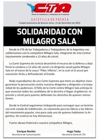 Desde la CTA de las Trabajadoras y Trabajadores de la Argentina nos solidarizamos con la compañera Milagro Sala, integrante de esta Central injustamente condenada a 13 años de cárcel.