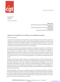 Con la firma de su secretaria general Sophie Binet, la CGT Francia envió una carta en apoyo y solidaridad a la CTA-T, la CTA-A y la CGT, ante la avanzada del gobierno de Javier Milei con medidas que afectan al conjunto de la clase trabajadora.