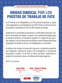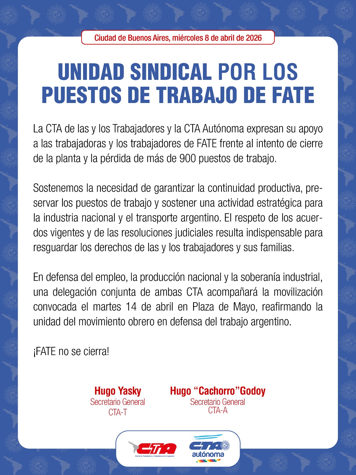 La CTA de las y los Trabajadores y la CTA Autónoma expresan su apoyo a las trabajadoras y los trabajadores de FATE frente al intento de cierre de la planta y la pérdida de más de 900 puestos de trabajo.