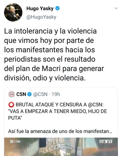 Para Yasky, “si Macri pone en su Twitter ´Feliz día y libres´ y agita a sus seguidores está clara la responsabilidad que tienen él, (Patricia) Bullrich o (Alfredo) Cornejo, que sueñan con ser como la versión argentina de Bolsonaro" y añadió: "Esto es tremendo. En este país hubo un genocidio señores".